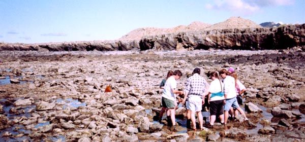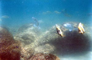 The intertidal and subtidal substrate is composed of a hard basaltic diabase rock in the vicinity of Puerto Lobos, which harbor a depauperate assemblage of fish (Thomson 2000), and intertidal invertebrates (Brusca, 1980). Towards the opposite end of Bahia San Lorenzo, in the vicinity of Sierra Julio, the intertidal is composed of large basalt and granite boulder fields, which in contrast to Puerto Lobos, harbor an incredibly diverse assemblage of intertidal invertebrates. The picture bellow illustrates one of the intertidal boulder fields, being surveyed by University of Arizona students. (see Research) |