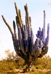 The vegetation of the area supports this contention, especially by the fact that nonnative species have yet to be found (West, pers. comm.). The vegetation of San Lorenzo is remarkably diverse, representing transition zones of various Sonoran Desert subdivisions. This is exemplified by the columnar cacti, represented by four species, saguaro (Carnegia gigantea), sinita (Lophocereus schottii), organ pipe (Stenocereus thurbei), and cardon (Pachycereus pringlei). Some of the floral assemblages reach their northern most extension here such as foothills thornscrub in the mountains, and mangrove estuaries in the vicinity of Puerto Lobos (Brown and Lowe 1980, Brown 1994). The predominant vegetation is that of the Central Gulf Coast subdivision, which contain a significant number of species of disjunct populations that are localized to this area in Sonora, yet widely distributed on the Baja California peninsula (Brown 1994). Of particular interest is the boojum tree (Foqueria columnaris), which is characteristic of the Vizcaino region on the Baja California peninsula and occurs in the mountain range of Sierra Cirrio, just south of San Lorenzo (Humphrey 1974). Unfortunately, Sierra Cirrio is now a private hunting ranch and access is prohibited or very limited at best, even to the local communities that have historically used the land. Also found on San Lorenzo, are extensive growths resembling forests of cardon cacti (Pachycereus pringlei) and elephant tree (Bursera microphylla, and B. hindsianum). The cardon is an awesome columnar cactus that dwarfs the saguaro (Carnegia gigantea), both in height and mass. Please note the size of the person bellow the cardon cactus in the following picture. |